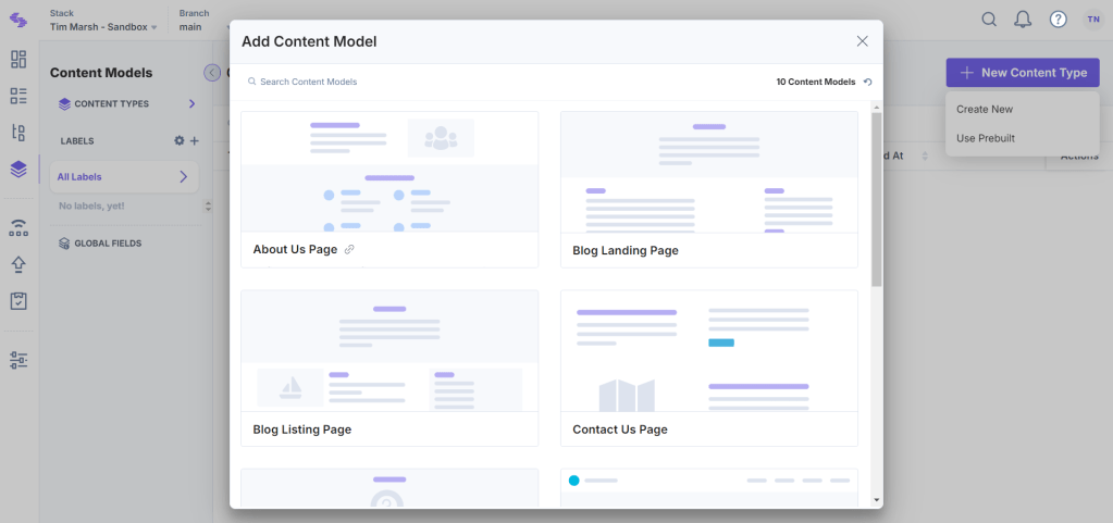 I wanted to take a look at the Content Types section. That is the first place to start. You need these to start building pages. You have a dropdown to create a new content type. One part that grabbed my attention was the use prebuilt choice.