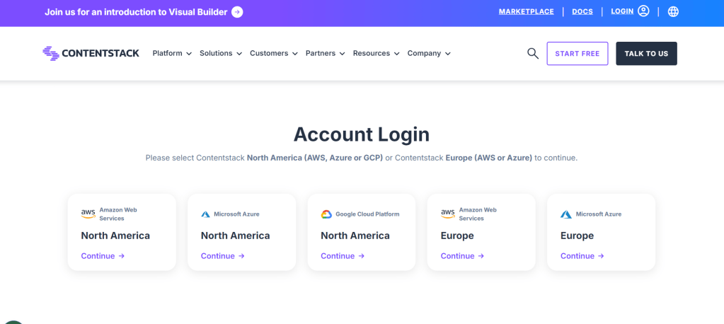 My very first impression is that Contentstack asks you what region and cloud provider you want to login to. This at first felt strange as users of SaaS platforms don’t normally get the choice.