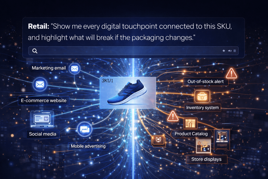 Instead of disconnected records, everything is connected through explicit relationships. Content, assets, products, taxonomy, workflow states, variants, channels, and rights all exist in a single, connected model.
