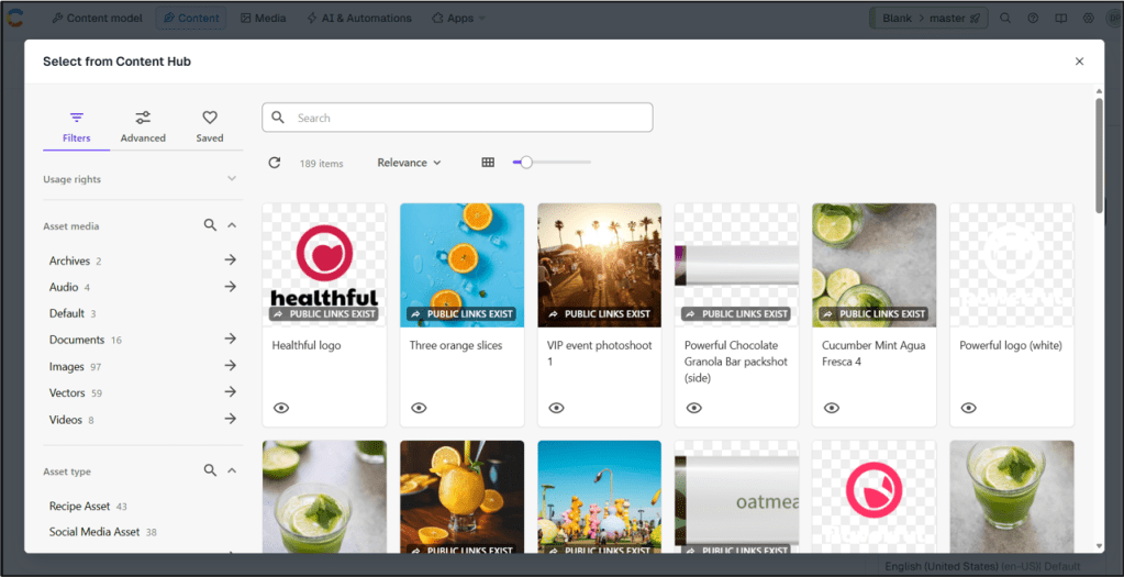 Authors in Contentful can browse and select governed assets from Content Hub directly inside their workflow.