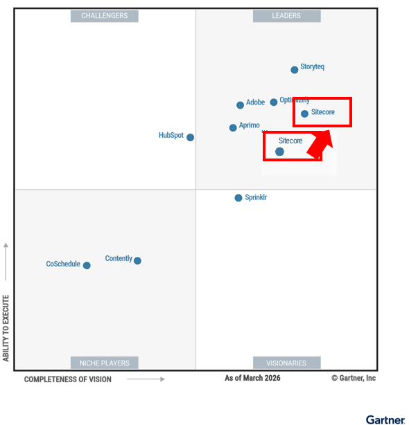 2026 – Sitecore holds the Leader position and extends its vision score. Agentic automation, C2PA provenance tracking and the SitecoreAI roadmap are the things Gartner specifically calls out.